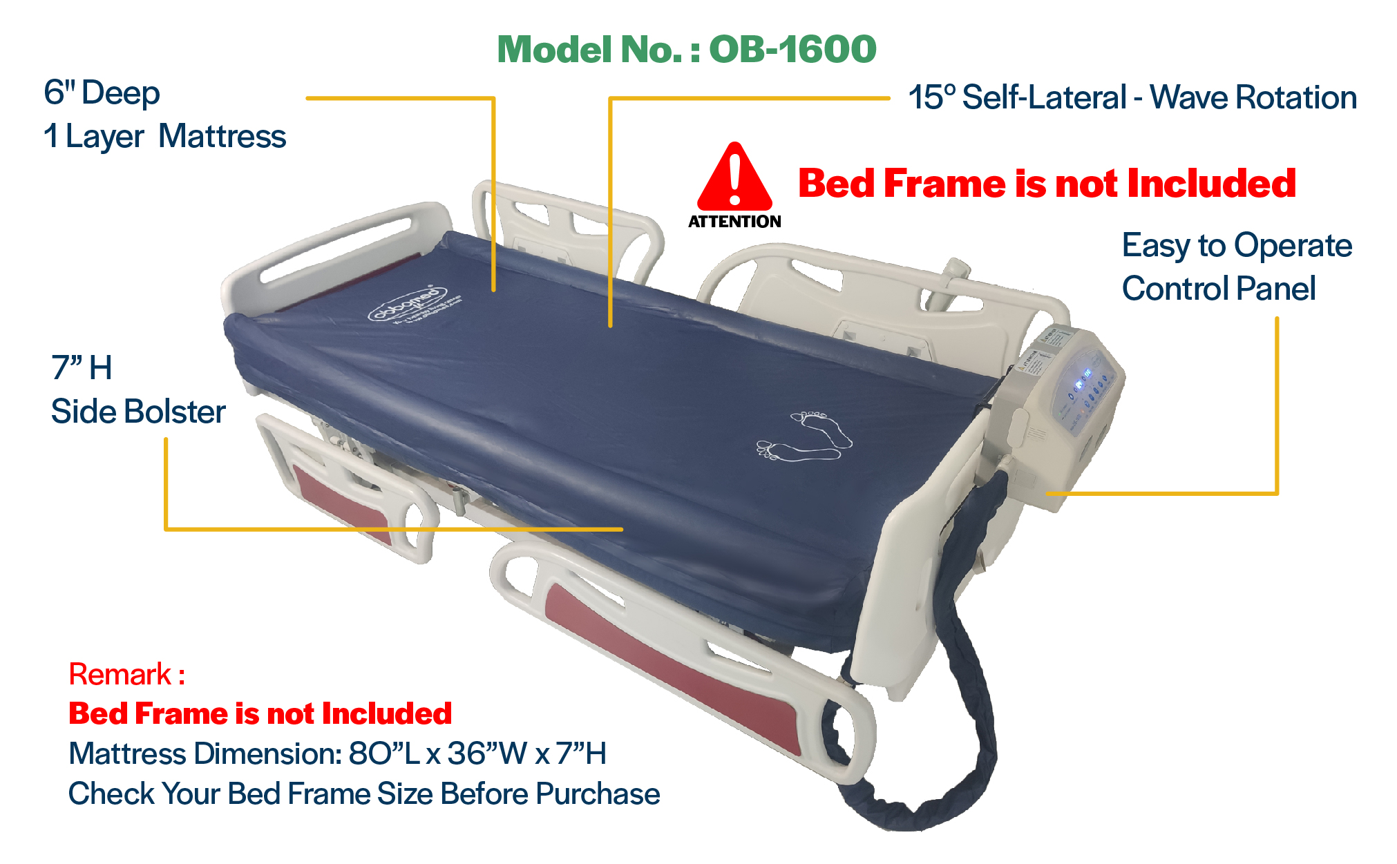 OB-1600 Mattress dimension and weight specifications: